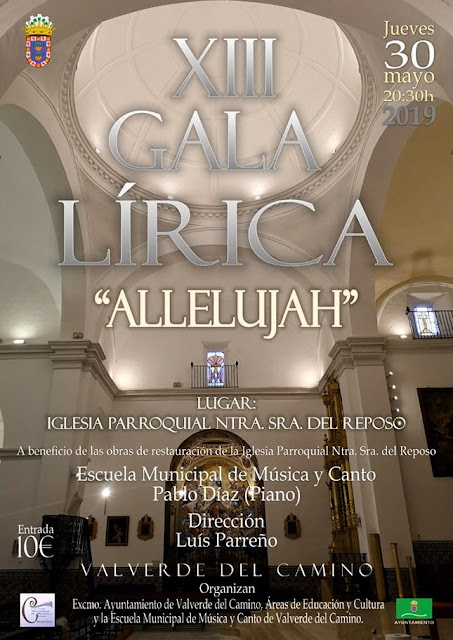 Este jueves, 30 de mayo, a las 20’30h, en la iglesia Parroquial y a beneficio de ella, la Escuela Municipal de Canto de Valverde del Camino ofrece su tradicional Gala Lirica que alcanza la decimotercera edición. El altar mayor de nuestra parroquia será el escenario donde transcurra este autentico espectáculo de la lírica.