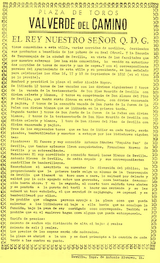 Tiene concedida a esta villa, varias corridas de novillos, destinados sus productos a beneficio de los pobres de su Real Cárcel. Y a la Escuela de Tauromaquia de la Ciudad de Sevilla, en vista de las facultades que por nuestro soberano le han sido concedidas, ha venido a autorizar dos corridas de toros de muerte y una capea. Y en el correspondiente permiso del ayuntamiento de esta Villa y su presidente, se han señalado para celebrarlas los días 16-17 y 18 de septiembre de 1832 (si el tiempo lo permite).