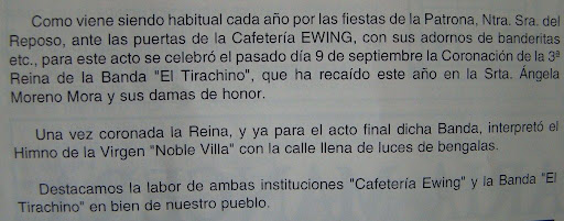 “Como viene siendo habitual cada año por las fiestas de la Patrona, Nuestra. Señora del Reposo, ante las puertas de la cafetería EWING, con sus adornos de banderitas etc. para este acto, se celebró el pasado 9 de septiembre la Coronación de la 3ª Reina de la Banda “el Tirachino”, que ha recaído este año en la señorita Ángela Moreno Mora y sus damas de Honor.