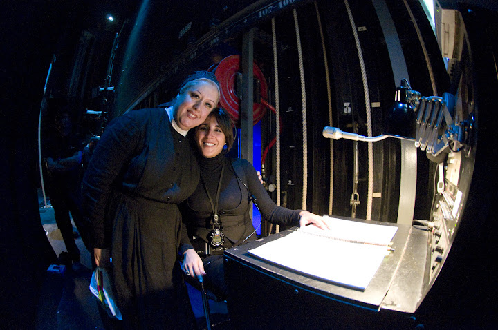 Dispone también de una mesa de trabajo con monitores desde los que controla los diferentes espacios, tanto delante como detrás del telón; aunque normalmente, esta moviéndose de un lugar a otro.