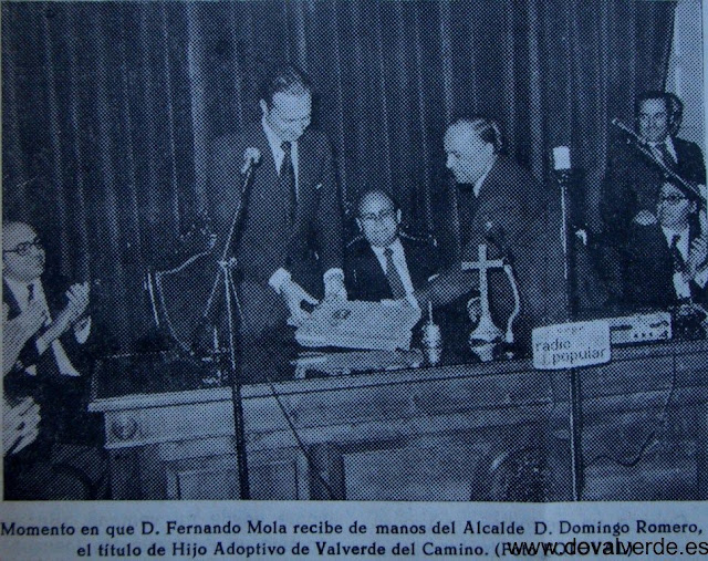 En la década de los 50 del siglo pasado, llegó a Valverde D. Fernando Mola a realizar funciones como Secretario del ayuntamiento, y con su entrega y amor a nuestro pueblo, inicio lo que pudiéramos llamar la segunda modernización de nuestra ciudad. Anteriormente a finales del siglo XIX los ingleses de la Alkali Company habían traído el ferrocarril a Valverde y con el un avance y modernización tanto de la industria como de la sociedad valverdeña.