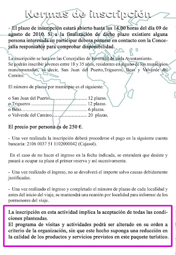 El plazo de inscripción acaba el próximo lunes 9 de agosto y pueden hacerla efectiva en la Casa de la Juventud en la Avda. de Andalucía de Valverde, llamando al teléfono 959551505 ó en el e-mail Esta dirección de correo electrónico está protegida contra los robots de spam, necesita tener Javascript activado para poder verla
