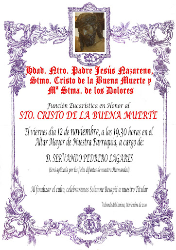 | Agenda 12 Noviembre. Función Eucarística en Honor a su titular Cristo de la Buena Muerte |