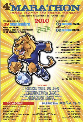 Los días 1 y 2 de octubre en la asociación valverdeña de futbol sala, en unión a la peña Q-3 organizan y patrocinan el 4º maratón de futbito en memoria de Francisco José Contioso “Conchicho” el día 29 de septiembre en el pabellón de Triana y desde las 8’30n de la mañana se procederá al sorteo y pago de la inscripción que asciende por equipo a 20€.