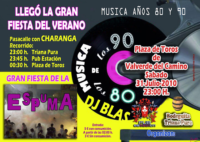 El próximo día 31 de julio en la plaza de toros se va a celebrar una fiesta cuyo tema va a ser la música de los años 80-90 y en la que entre otras muchas novedades vamos a poder disfrutar de una charanga que partirá de desde el Triana pura, llegara a la Estación y de allí a la plaza de toros, así como una gran fiesta de la espuma.