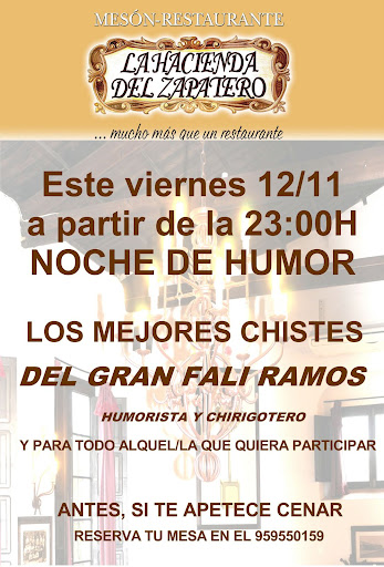 Noche de Humor en la Hacienda del ZapateroEl viernes 12 de noviembre a partir de las 23’00h Los mejores chistes del Gran Fali Ramos, humorista y chirigotero, pero además si quieres participar no lo dudes anímate, ven y pasa un buen rato con nosotros.