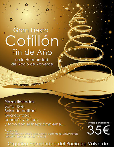 La Hermandad del Rocío de Valverde del Camino organiza su Gran Fiesta Cotillón “Fin de año 2010” para recibir el 2011 rodeado del mejor ambiente en una noche amenizada con música en directo a cargo de una orquesta y con todo tipo de detalles: Guardarropa, canapés y dulces, bolsa de cotillón y barra libre.