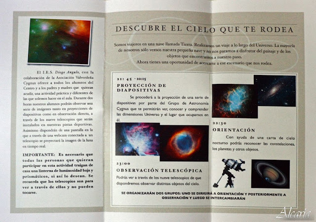 Bajo el lema "descubre el cielo que te rodea", los asistentes, profesores, alumnos y padres pudieron disfrutar de nociones astronómicas y una gran observación debido al buen cielo que había anoche para dicha observación. Los allí presentes vieron objetos como: la luna, Saturno, Venus, Marte, las galaxias M81 y M82, el Cúmulo de Hércules, la Nebulosa del Anillo, entre otros objetos.