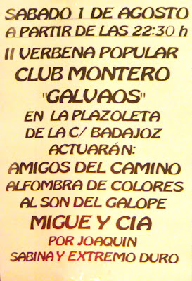 El próximo sábado 1 de agosto se va a llevar a cabo en la plazoleta de la calle Badajoz, la II verbena popular organizada por el Club de Monteros los Galvaos.