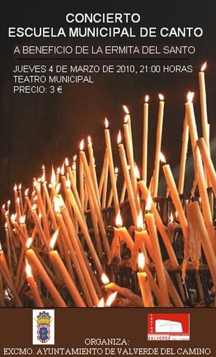 El próximo jueves día 4 de marzo de 2010 a partir de las 21:00 horas en el Teatro Municipal de Valverde del Camino, La Escuela Municipal de Canto, ofrecerá un concierto a Beneficio de las obras de reconstrucción de la Ermita del Santo.