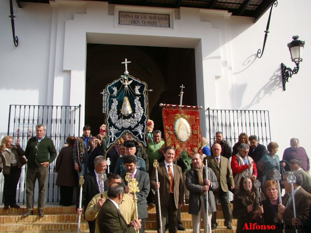 A pesar del temporal, los hermanos rocieros de Valverde no han querido dejar de asistir a la Misa de estatutos 2010, también han querido acompañar a la hermanada Valverdeña, todas las hermandades de Gloria y Penitencia de nuestro pueblo, San Antonio de Padua de la Peñuela, la Madrina de Valverde Hermandad de Trigueros así como nuestra ahijada Hermandad de San Sebastián de Los Reyes que se han desplazado desde la ciudad Madrileña con dicho fin y que han impuesto a nuestro Simpecado la medalla de oro de la Hermandad Rociera. También ha acompañado en tan significativa efeméride el alcalde de Valverde, capitán de la Guardia Civil y representante de grupos políticos.