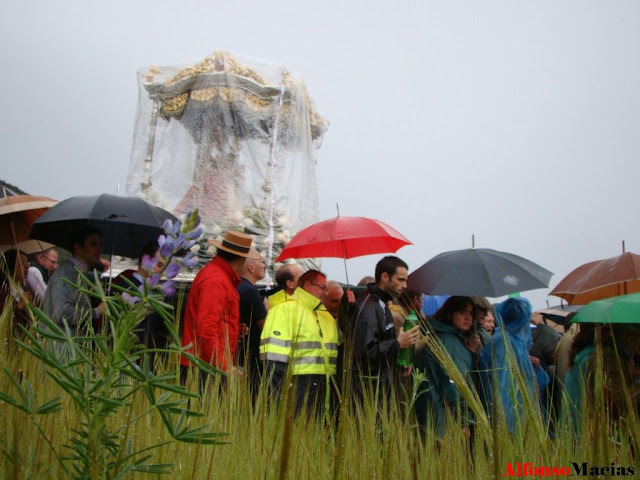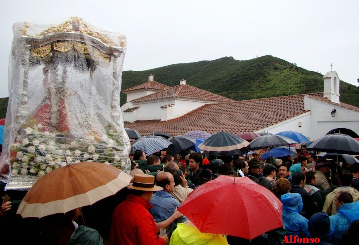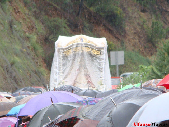 La patrona de Calañas ha vuelto a su santuario junto al rio Odiel en Sotiel Bajo una intensísima lluvia, hacia su entrada triunfal en Sotiel Coronada arropada por sus hijos la Virgen de la Coronada, después de haber estado en su pueblo desde el pasado lunes de pascua de resurrección.