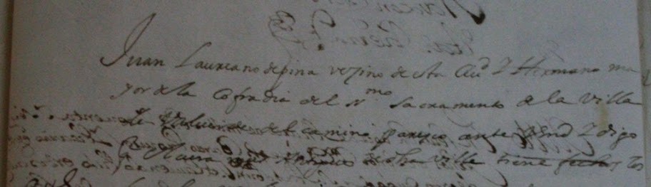 Juan Laureano de pina vezino de esta ciud y Hermano mayor de la cofradia del ssmo sacramento de la villa de Valverde del camino paresco ante V md y digo qe el cura mas antiguo de dha villa tiene fechos los despachos y diligencias que presento serca de que se vendan unas tierras de dha Cofradia.