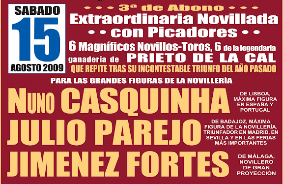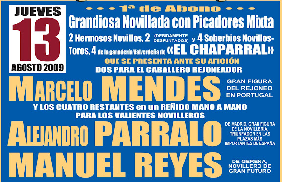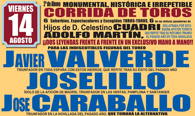 Una feria taurina llena de mimbres. Mano a mano entre ganaderos, una alternativa, el debút de una ganadería Valverdeña. La Feria Taurina de Valverde del Camino va a contar este año con varios paltos fuertes. A la novedad ya anunciada de ver en la misma corrida de toros reses de Celestino Cuadri y de Adolfo Martín, se le une la alternativa en esa misma corrida de José Caraballo, triunfador en la novillada del año pasado, que estará apadrinado por Javier Valverde y que contará con Joselillo para completar la terna del viernes 14 de agosto. Este año, la feria valverdeña tendrá dos novilaldas con picadores, una corrida y el tradicional Salto a la Fama. Abrirá los festejos el jueves 13 de agosto la novillada mixta de El Chaparral, hierro valverdeño que debuta este año en el coso valverdeño con reses para el rejoneador portugués Marcelo Mendes y nos novilleros Alejandro Parralo y Manuel Reyes. El viernes 14 será el turno de la corrida de Cuadri y Adolfo Martín, y el 15 de agosto, sábado, tendrá lugar la novillada de Prieto de la Cal para Nuno Casquinha, Julio Parejo y Jiménez Fortes.
